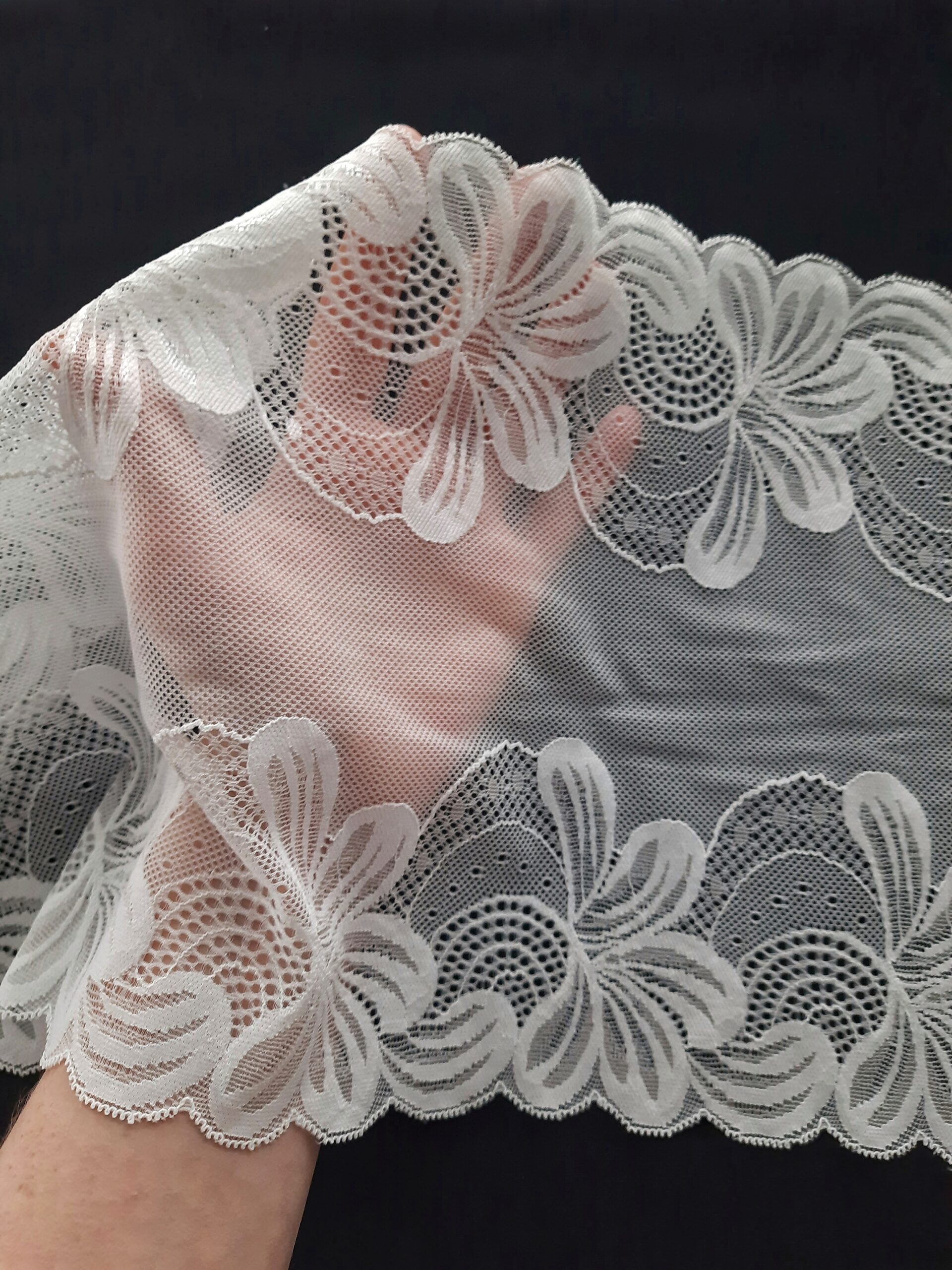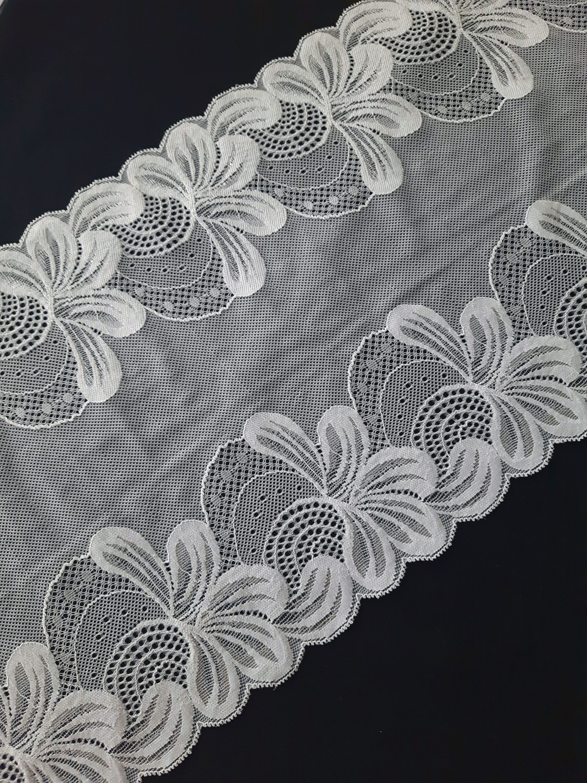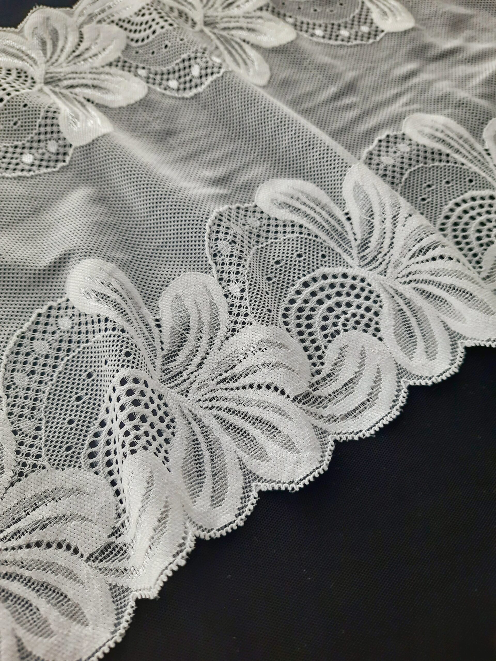 SKU: EL714 Categoría: Encaje elástico Etiquetas: bra making, bridal lace, embroidered lace, lace fabric, lace for sewing, lingerie sewing, sewing craft, Stretch lace, Trim lace, Underwear, underwear supplies, Wedding lace, White lace trim
