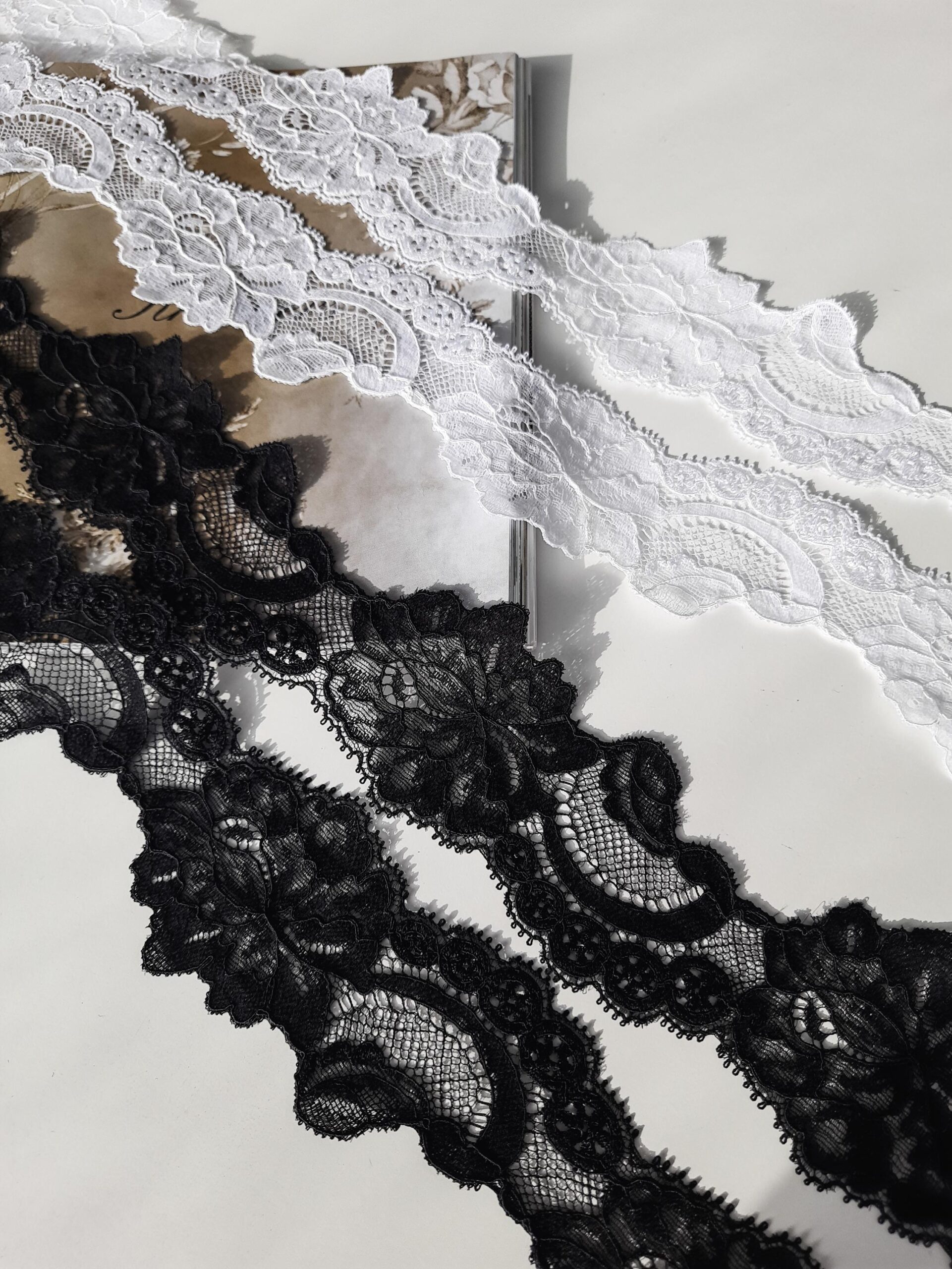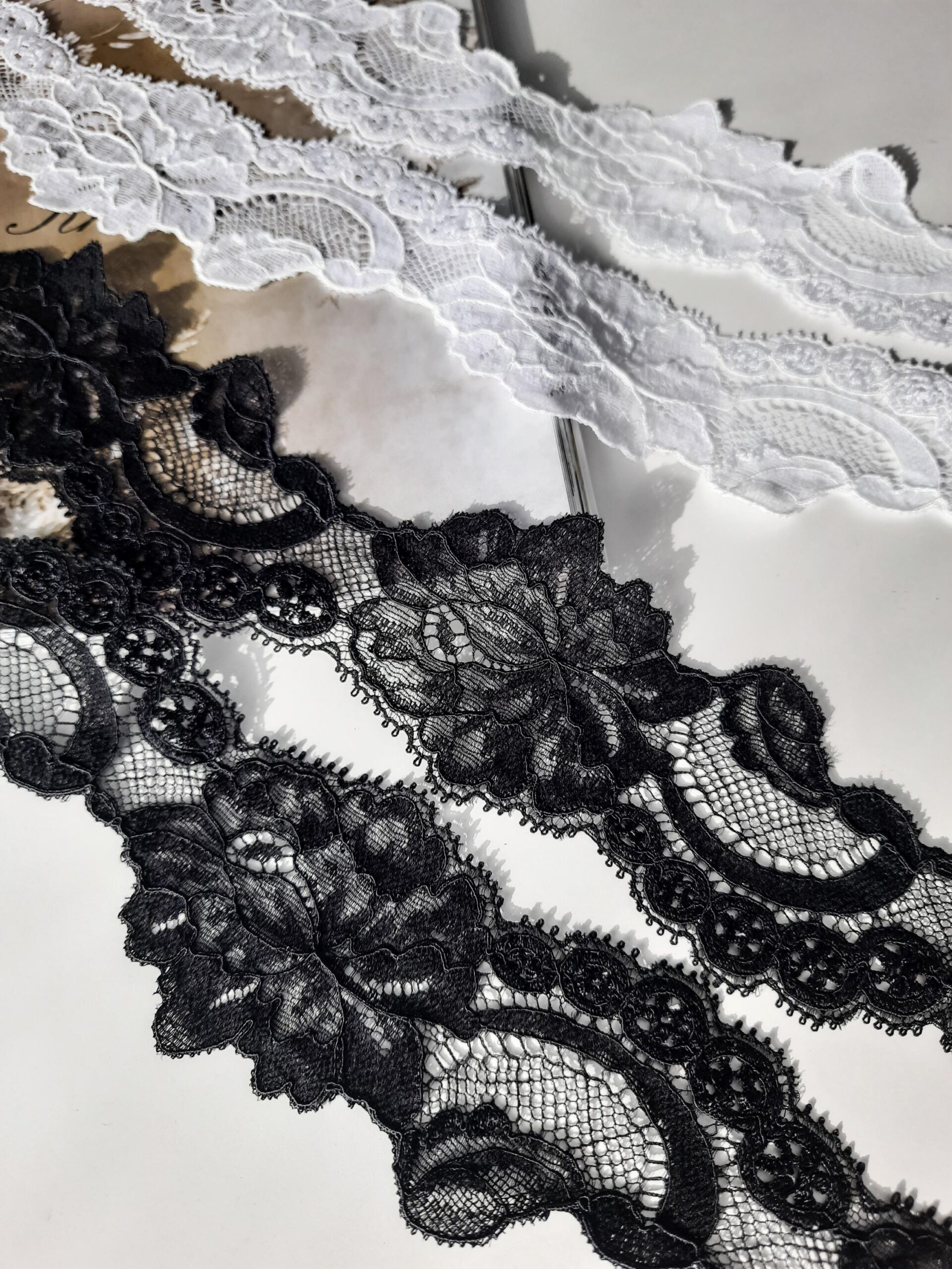 Narrow elastic lace is commonly used for decorative accents in lingerie and sleepwear and for finishing garment edges Width: 5.5 cm/1.96'' 76% POLYAMIDE 24% ELASTANE Sold by the 1 meter Stretch Please be aware that while we will do our best to provide continuous metrages, the ordered quantity may be divided into various parts.